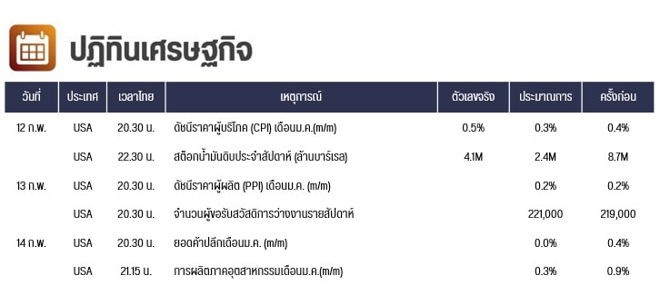 คืนนี้สหรัฐฯ คืนนี้สหรัฐจะมีการเผยดัชนีราคาผู้ผลิต (PPI) เดือนม.ค. และจำนวนผู้ขอรับสวัสดิการว่างงานรายสัปดาห์ ในช่วงเวลา 20.30 น.