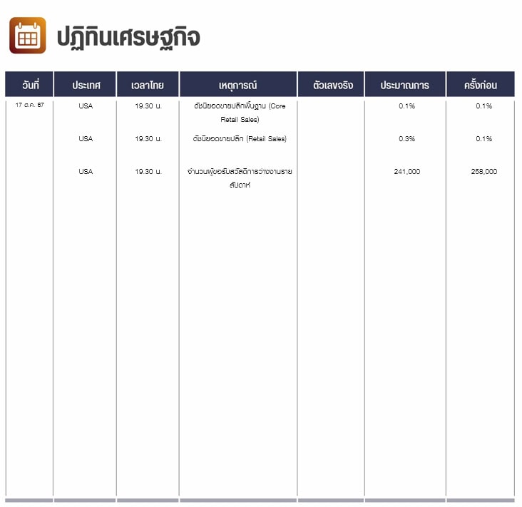 คืนนี้สหรัฐไม่มีการเปิดเผยตัวเลขเศรษฐกิจที่สำคัญ แต่จะมีการเปิดเผยยอดค้าปลีก (Retail Sales) ของเดือนกันยายน ในคืนวันพฤหัสบดี