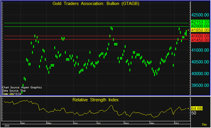 ราคาทองคำแท่งฟื้นตัวขึ้นมาจากปัญหาความไม่สงบทางภูมิรัฐศาสตร์ แม้ค่าเงินบาทจะเริ่มแข็งค่า จากแนวโน้มการลดดอกเบี้ยของ Fed ว่าอาจลดดอกเบี้ยในการประชุมเดือน พ.ย. ลงเพียง 0.25% แนะนำรอซื้อที่ 41,600 บาท โดยมีเป้าทำกำไรที่ 42,000 บาท และตัดขาดทุนหากหลุดแนวรับที่ 41,450 บาท