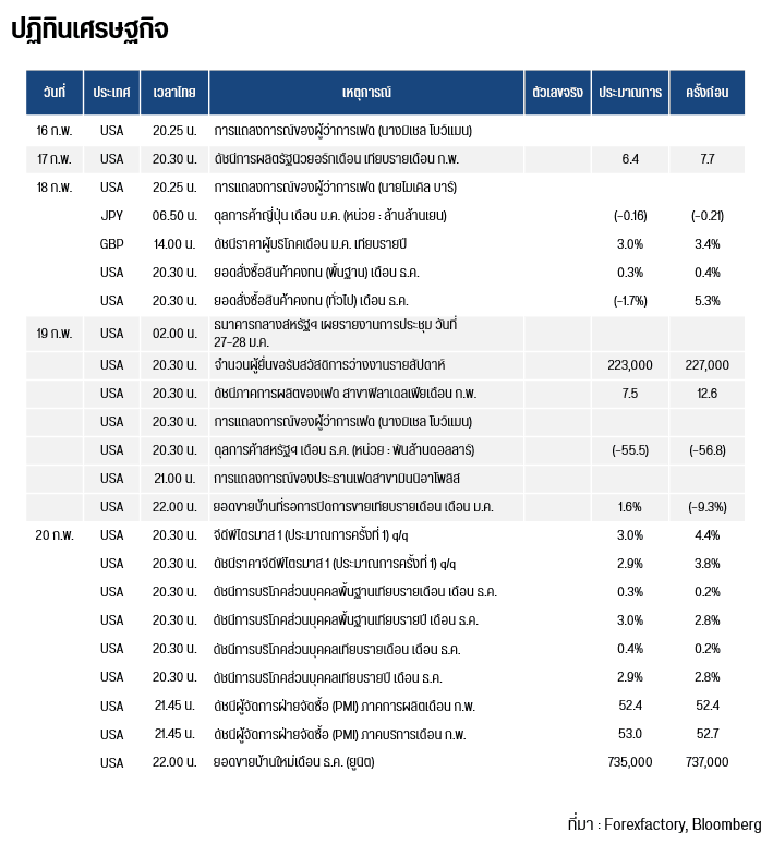 ทองโลกยังมีการปรับฐานลง จากการที่ดัชนีเงินดอลลาร์ (DXY) เริ่มมีแนวโน้มแข็งค่าขึ้นเป็นวันที่ 2 สู่ระดับ 97.22 หน่วย จาก 96.87 หน่วย ในขณะที่ปริมาณการซื้อขายที่เบาบางเนื่องจากตลาดส่วนใหญ่ในฝั่งเอเชียปิดทำการในเทศกาลตรุษจีน และวันหยุดปธน.สหรัฐฯ ทั้งนี้ นักวิเคราะห์จาก City Index ได้เตือนว่าความเสี่ยงในระยะขาลงจะเพิ่มมากขึ้นหากราคาทองคำยังคงอยู่ต่ำกว่าระดับ 5,000 ดอลลาร์ เป็นเวลานาน เนื่องจากจะเป็นการบั่นทอนความมั่นใจของนักลงทุนฝั่งซื้อ (Bullish) ท่ามกลางความผันผวนที่เกิดขึ้นในปัจจุบัน นอกจากนี้ .ปธน.โดนัลด์ ทรัมป์ ได้เปิดเผยขณะอยู่บนเครื่องบิน Air Force One ว่า ตนกำลังอยู่ระหว่างการหารือกับปธน.สี จิ้นผิง เกี่ยวกับประเด็นการขายอาวุธให้แก่ไต้หวันในอนาคต เพื่อเป็นการปูทางให้ผู้นำทั้งสองประเทศจะมีกำหนดการพบปะกันอย่างเป็นทางการ ณ ประเทศจีน ในเดือน เม.ษ.นี้ ซึ่งเป็นสัญญาณของความตึงเครียดระหว่างจีน – สหรัฐฯ ที่ผ่อนคลายลง อย่างไรก็ตาม สถานการณ์อิหร่าน – สหรัฐฯ ยังคงตึงเครียด หลังจากกองกำลังพิทักษ์การปฏิวัติอิสลามของอิหร่าน (IRGC) เริ่มการซ้อมรบในช่องแคบฮอร์มุซ โดยมีเป้าหมายเพื่อเตรียมความพร้อมต่อภัยคุกคามด้านการทหารที่อาจเกิดขึ้นในช่องแคบฮอร์มุซ หลังจากที่สหรัฐฯ ได้ส่งกองเรือขนาดใหญ่เข้าประจำการใกล้อิหร่าน