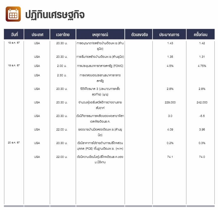 คืนนี้สหรัฐฯ จะเปิดเผยการอนุญาตก่อสร้างบ้านและการเริ่มก่อสร้างบ้านเดือนพ.ย. ตลาดคาดว่าจะเพิ่มขึ้นสู่ระดับ 1.43 และ 1.35 ล้านยูนิต ตามลำดับ นอกจากนี้ติดตามการประชุมธนาคารกลางสหรัฐฯ และการแถลงของประธานเฟดในคืนนี้