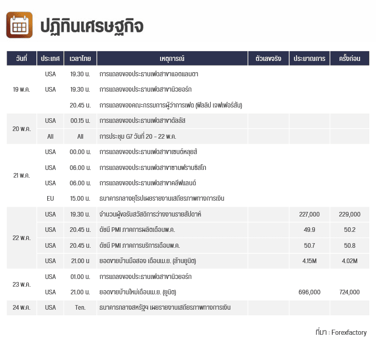 คืนนี้ สหรัฐฯ จะมีการจำนวนผู้ขอรับสวัสดิการว่างงานรายสัปดาห์,ดัชนี PMI ภาคการผลิตและการบริการเดือนพ.ค. และยอดขายบ้านมือสอง เดือนเม.ย.