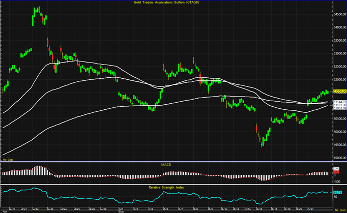 ทองคำในประเทศที่ฟื้นตัวขึ้นมาในช่วงเช้า ยังคงติดแนวต้านสำคัญอยู่ที่ระดับ 51,600 บาท จึงประเมินว่าราคาอาจปรับตัวลง และยังคงแนะนำใช้กลยุทธ์เชิงรับ โดยมีระดับราคาที่อาจใช้เสี่ยงทยอยซื้อเพื่อทำกำไรระยะสั้นที่ 50,000 และ 49,500 บาทตามลำดับ