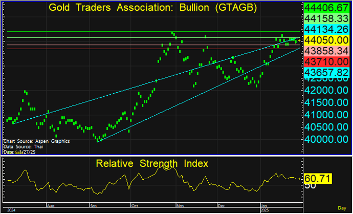 ราคายังคงติดแนวต้านสำคัญที่ระดับ 44,150 บาท ระยะสั้นประเมินว่าอาจปรับตัวลงสู่แนวรับ จึงแนะนำใช้กลยุทธ์เชิงรับในการเข้าซื้อ ประเมินแนวรับสำคัญไว้ที่ระดับ 43,800 บาท โดยมีเป้าหมายทำกำไรที่ 44,150 บาท และตัดขาดทุนที่ 43,700 บาท