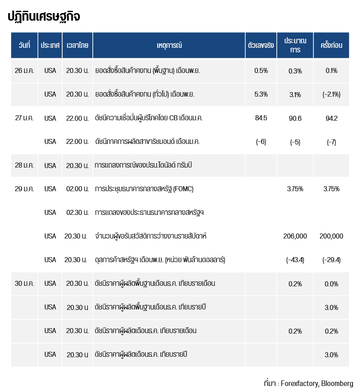 ทองโลกเริ่มมีการปรับตัวขึ้นต่อเนื่อง จากการที่ดัชนีเงินดอลลาร์ (DXY) มีแนวโน้มทรงตัวที่ระดับ 96.13 หน่วย อีกทั้งบอนด์ยีลด์สหรัฐฯ อายุ 10 ปี มีแนวโน้มทรงตัวที่ระดับ 4.23% สืบเนื่องมาจากหลังปธน.ทรัมป์ได้กล่าวเมื่อวันที่ 26 ม.ค. ว่า ตนไม่คิดว่าเงินตอนนี้เงินดอลลาร์อ่อนค่าลงมากจนเกินไป ซึ่งเป็นการตอกย้ำถึง”การเทรดบนการเสื่อมค่าของเงิน” (Debasement trade) โดยนายโรดริโก แคทริล นักยุทธศาสตร์ด้านสกุลเงินจาก National Australia Bank ในซิดนีย์ ได้กล่าวว่า ความเห็นของปธน.ทรัมป์ เป็นสัญญาณว่ารัฐบาลสหรัฐฯ ไม่ได้ต่อต้านการลดลงของดอลลาร์ แต่เป็นเพราะสหรัฐฯ ต้องการเห็นสกุลเงินอย่างเงินหยวนของจีนและเงินเยนของญี่ปุ่นแข็งค่าขึ้น ในขณะที่ตลาดยังได้กังวลถึงหน่วยงานรัฐฯ ต่างๆที่เสี่ยงการถูกชัตดาวน์บางส่วน (Partial Shutdown) หากงบประมาณยังคงผ่านเพียง 6 ต่อ 12 ส่วน อาทิเช่น การเดินทางทางอากาศ / กรมสรรพากร (IRS) / สถาบันสุขภาพแห่งชาติ (NIH) และข้อมูลจากกระทรวงแรงงานที่มีการประกาศตัวเลขทางเศรษฐกิจต่างๆ อาจต้องหยุดทำการ ซึ่งส่งผลถึงการคาดการณ์ทางเศรษฐกิจของเฟด และการเข้าถึงสินเชื่อของประชาชนเนื่องด้วยต้องใช้ฐานข้อมูลจาก IRS และอาจทำให้เศรษฐกิจสหรัฐฯ ต้องหยุดชะงักบางส่วน อย่างไรก็ตาม ตลาดยังคงจับตาถ้อยแถลงของนายเจอโรม พาวเวล ประธานเฟด เกี่ยวกับทิศทางดอกเบี้ยหลังจากนี้ไปว่า จะมีมุมมองที่ผ่อนคลายหรือตึงตัวทางเศรษฐกิจ