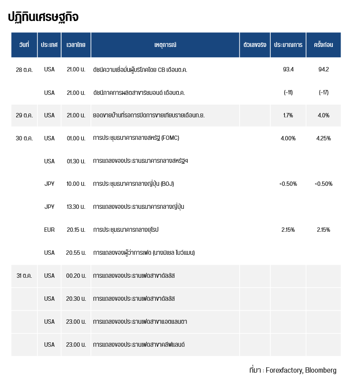 ทองโลกมียังคงปรับตัวลงต่อเนื่อง จากการที่ปธน.โดนัลด์ ทรัมป์ ได้ลงนามร่วมกับนาง ซานาเอะ ทาคาอิจิ ในเรื่องข้อตกลงการค้าด้านแร่ธาตุสำคัญ รวมถึงแพ็จเกจการลงทุนมูลค่า 550,000 ล้านดอลลาร์ แต่ทว่ายังขาดความชัดเจนในรายละเอียดดังกล่าว อีกทั้งทาคาอิจิยังได้แสดงความมุ่งมั่นที่จะส่งเสริมการบรรลุภูมิภาคอินโด-แปซิฟิก ในขณะที่เมื่อวันศุกร์ก่อนหน้านี้ ทาคาอิจิได้แสดงท่าทีที่แข็งกร้าวและต้องการบรรลุการใช้จ่ายด้านกลาโหมที่ 2% ของ GDP ภายในเดือนมี.ค. 2026 จากปัจจัยข้างต้น สามารถแสดงได้ถึงการตึงเครียดทางการค้าที่ลดลงอย่างเห็นได้ชัด อย่างไรก็ตาม ดัชนีเงินดอลลาร์ (DXY) ได้มีแนวโน้มทยอยอ่อนค่าเป็นวันที่ 5 ลงสู่ระดับ 98.68 หน่วย จากเดิมที่ 98.96 หน่วย ในขณะที่บอนด์ยีลด์สหรัฐฯ อายุ 10 ปีได้ปรับตัวลงเป็นวันที่ 2 สู่ระดับ 3.97% จาก 4.02% นอกจากนี้ ตลาดยังคงจับตาทรัมป์ – ปธน. สี จิ้นผิง ในการประชุม APEC ที่เกาหลีใต้ ในวันที่ 30 ต.ค. นี้ โดยประเด็นหลักที่ต้องจับตาคือ แร่หายาก ถั่วเหลือ และยาเฟนทานิล