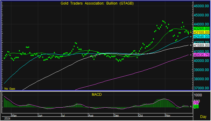 ราคาทองคำปรับตัวขึ้นเล็กน้อย แต่คาดว่าอาจยังติดบริเวณแนวต้านของเส้น SMA20 บริเวณ 43,300 ดอลลาร์ แนะนำชะลอการเข้าซื้อ เพราะราคาทองคำแท่งอาจปรับตัวลงเมื่อทดสอบแนวต้านดังกล่าว ทั้งนี้การเข้าซื้อรอบใหม่แนะนำรอบริเวณ 42,600 บาท