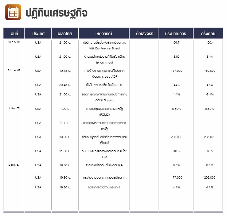 คืนนี้สหรัฐจะเปิดเผยดัชนีความเชื่อมั่นผู้บริโภคเดือนก.ค. โดย Conference Board ตลาดคาดว่าจะลดลงสู่ 99.7 จาก 100.4 ในเดือนมิ.ย. และจำนวนตำแหน่งงานที่เปิดรับสมัคร ตลาดคาดว่าจะลดลงสู่ 8.02 ล้านตำแหน่ง จาก 8.14 ล้านตำแหน่งในเดือนพ.ค.
