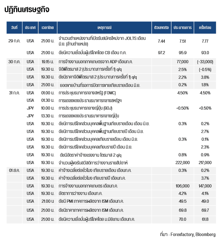 ปธน. ทรัมป์ ส่งสัญญาณอาจเก็บภาษีนำเข้าสินค้าอินเดียในอัตรา 20–25% หากอินเดียยังไม่เปิดตลาดสินค้าให้สหรัฐฯ อาทิเช่น พืช GMO , นม และยานยนต์ สืบเนื่องมาจากการที่ประชาชนอินเดียหลายล้านคนพึ่งพาการเกษตรเพื่อการยังชีพ อีกทั้งประชาชนกลุ่มนี้ยังเป็นฐานเสียงหลักของพรรคโมดี ในขณะที่บริษัทในสหรัฐฯ ที่ผลิตสินค้าอุปโภคบริโภคได้แจ้งต่อบริษัทยักษ์ใหญ่อย่าง Walmart ว่า บริษัทจำเป็นต้องขึ้นราคาสินค้าบางรายการในสหรัฐฯ ตั้งแต่สัปดาห์หน้าเป็นต้นไป อีกทั้งบริษัทผลิตสินค้าอุปโภคบริโภคยักษ์ใหญ่สหรัฐฯ อย่าง P&G เผยว่า จะปรับขึ้นราคาสินค้าประมาณหนึ่งในสี่ของผลิตภัณฑ์ในสหรัฐฯ ซึ่งส่งผลให้เงินเฟ้อสหรัฐฯ อาจขยายตัวขึ้นในช่วงครึ่งปีหลังนี้ และกดดันให้เฟดลดดอกเบี้ยยากขึ้น อย่างไรก็ตาม ตลาดยังคงติดตามถ้อยแถลงของนาย เจอโรม พาวเวล ประธานเฟด ในการประชุมธนาคารกลางสหรัฐ (FOMC) ในคืนนี้ เพื่อประเมินทิศทางเศรษฐกิจสหรัฐฯ ต่อไป โดยตลาดคาดการณ์ถึง 97% ว่าเฟดจะยังคงดอกเบี้ย 4.25-4.5% ในการประชุมครั้งนี้ และจะเริ่มลดดอกเบี้ย 0.25% ในเดือน ก.ย. และ ธ.ค.