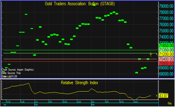 จึงแนะนำทยอยขายตามแนวต้านที่ระดับ 71,350 และทยอยซื้อตามแนวรับที่ 70,400 บาท แต่หากราคาหลุดแนวรับที่ 70,000 บาท ลงไป แนะนำขายตัดขาดทุน