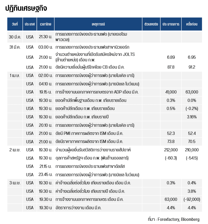 คืนนี้เวลา 21.00 น.เผยจำนวนตำแหน่งงานที่เปิดรับสมัครใหม่จาก JOLTS (ล้านตำแหน่ง) เดือน ก.พ. และ ดัชนีความเชื่อมั่นผู้บริโภคโดย CB เดือน มี.ค. , เวลา 02.00 น. และ 04.10 น. สหรัฐ เผยการแถลงการณ์ของผู้ว่าการเฟด นายไมเคิล บาร์ / นางมิเชล โบว์แมน ตามลำดับ