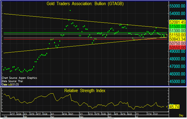 ราคาทองในประเทศอยู่ในระยะ Sideway จากการที่ทองโลกฟื้นตัวในกรอบจำกัด ขณะที่ค่าเงินบาทแข็งค่าระยะสั้น จึงแนะนำเข้าซื้อสะสมแนวรับที่ระดับ 50,750 บาท และขายทำกำไรหากราคาทดสอบแนวต้านที่ 51,300 บาท แต่หากราคาหลุดแนวรับที่ 50,550 บาท ลงไป แนะนำขายตัดขาดทุน